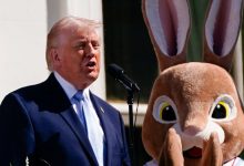 U.S. President Donald Trump, standing next to the Easter Bunny, speaks the 2026 White House Easter Egg Roll at the…