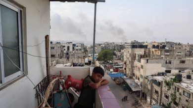 A boy stands on a balcony with a view of billowing smoke from Israeli strikes in Rafah city, southern…