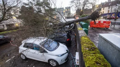 A fallen tree falls on four cars in Linlithgow during Storm Isha Credit: Katielee Arrowsmith, SWNS Britain is bracing for…