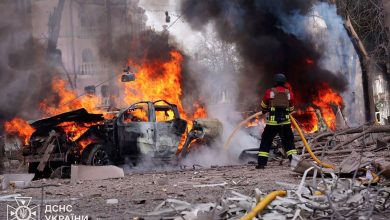 A Ukrainian rescuer works to extinguish a fire at the site of a missile attack in Sumy, northeastern Ukraine, April…