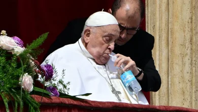 Pope Francis sips water with a straw during his appearance on the balcony of St Peter’s basilica during the Urbi…
