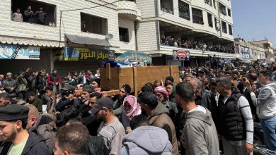 Mourners carry the casket of one of several people killed in reported Israeli shelling on Nawa, Daraa, southern Syria,…