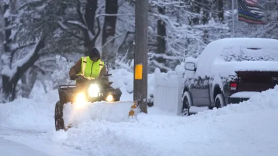 A man plows a snow covered driveway, Sunday, Jan. 7, 2024, in Derry, N.H. Some areas of New England…