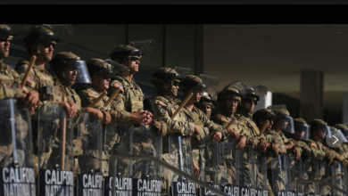 U.S Marines work next to members of the California National Guard outside of a federal building, Friday, June 13, 2025,…