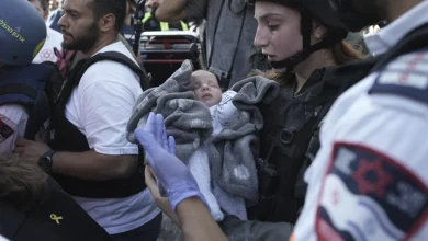 A baby is evacuated from the site of a direct hit from an Iranian missile strike in Ramat Gan, Israel,…