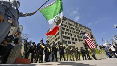 Protesters block the driveway to the Federal Building as police stand guard in Santa Ana, Calif., on Monday, June 9,…