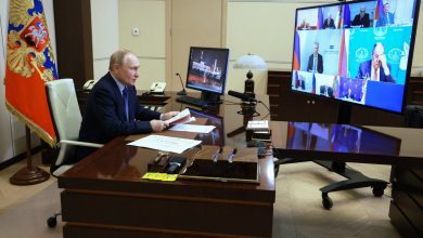 Russian President Vladimir Putin chairs a meeting with members of the Security Council via video link at the Novo-Ogaryovo…