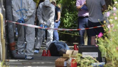 Ukrainian forensic experts work at the scene of a shooting that killed former parliament speaker Andriy Parubiy in western Lviv,…