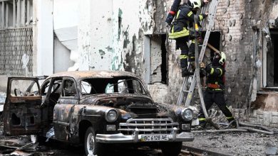 Firefighters are seen next to a burnt-out car following mass Russian drone and missile strikes, in Lviv, western Ukraine, July…