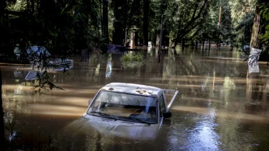A car is seen submerged in flooded water at Mirabel RV Park & Campground after severe weather in Forestville, Calif.,…