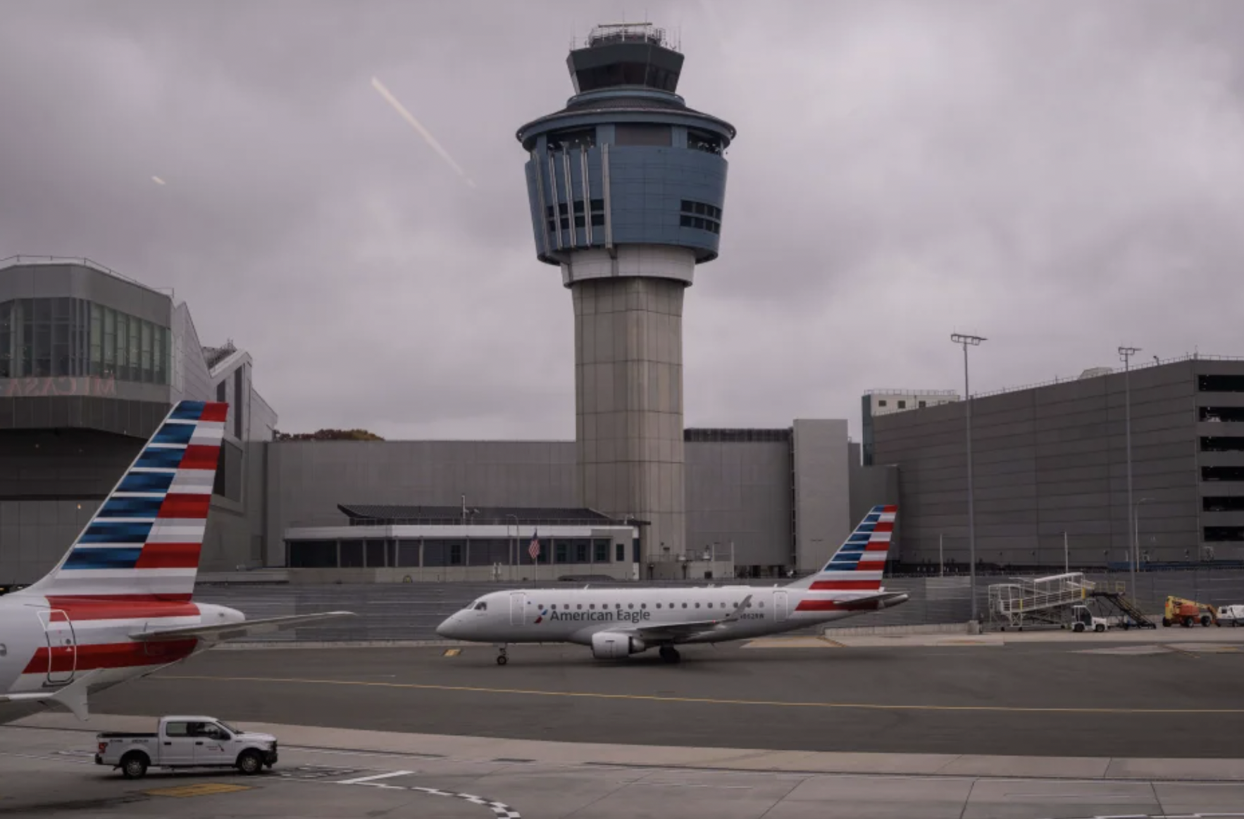 An American Eagle plane moves past the FAA Air Traffic Control tower at LaGuardia Airport (LGA) in the Queens borough of New York, Sunday, Nov. 9, 2025. (AP Photo/Adam Gray)